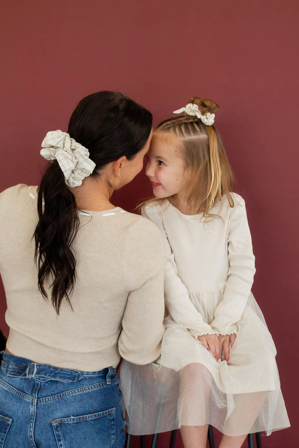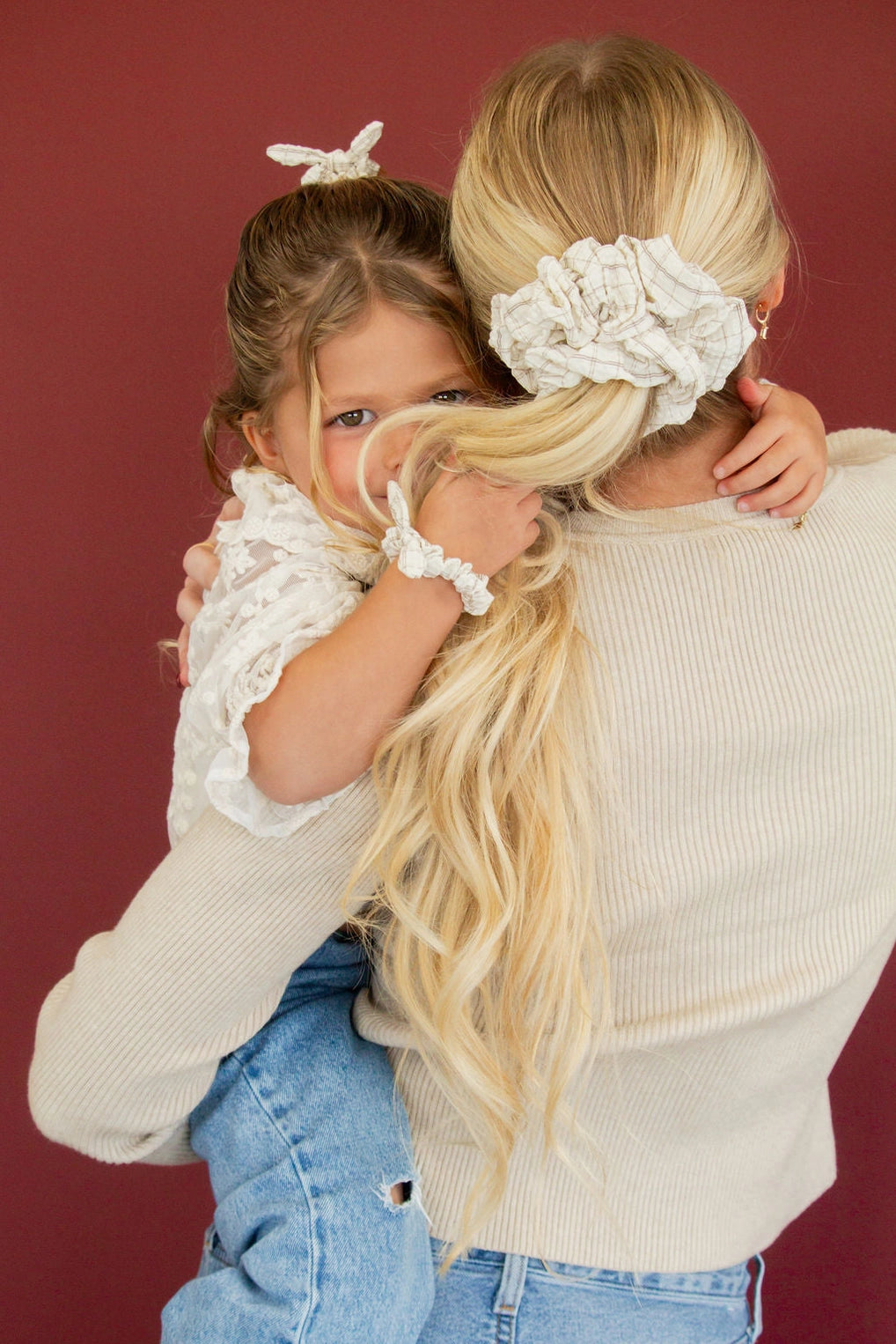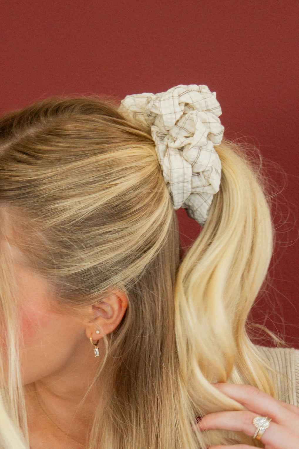 This perfect jumbo scrunchies is from our Andi x Qlov collab. It is made out of a slightly textured fabric and has a minimal tan gingham pattern throughout. I am obsessed with the colors. You'll grab this scrunchie every time because of the neutral colors and perfect hold.