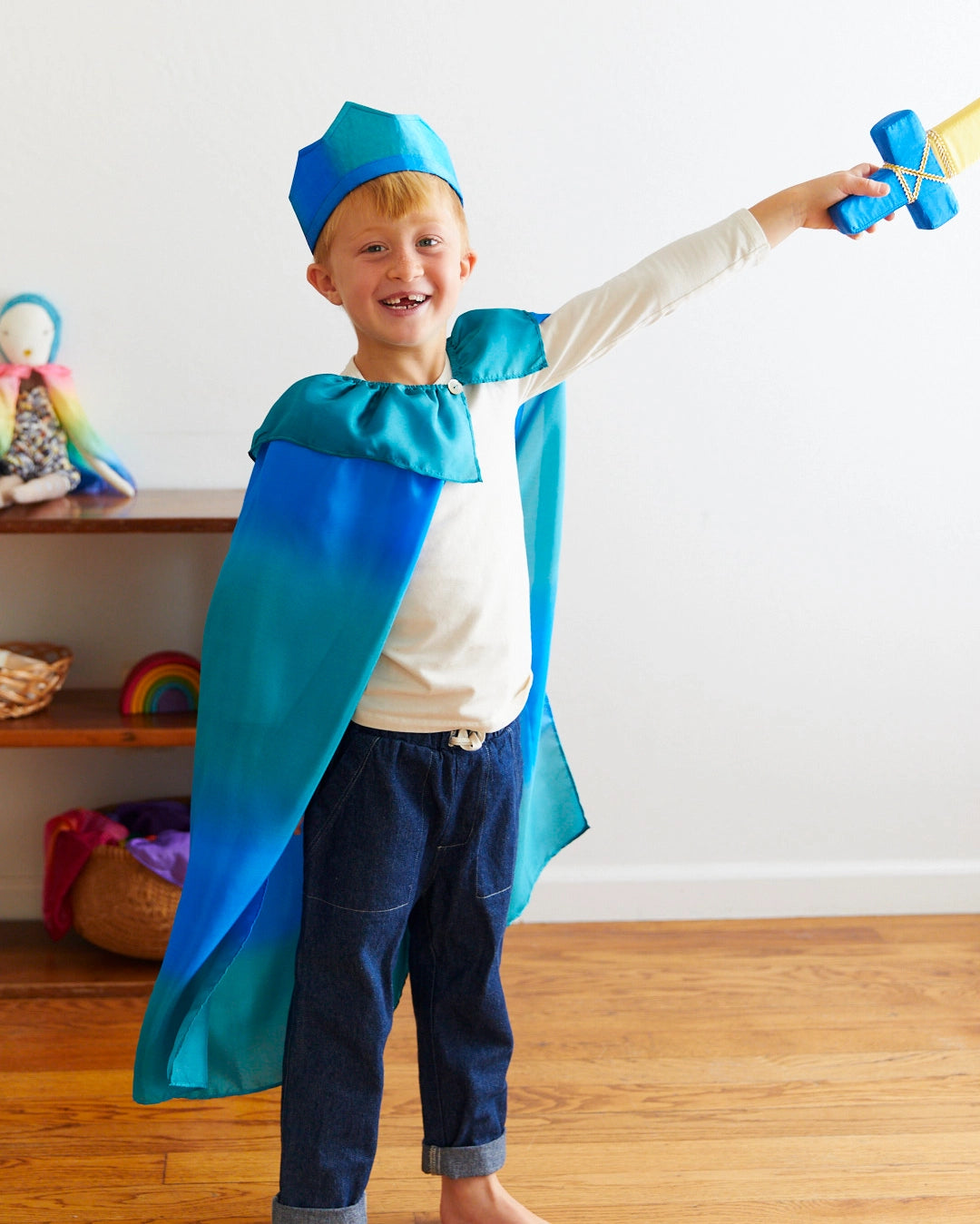 Blue Soft Swords measure 17-inches in length and are made from soft but stiff foam. Covered with our royal blue jacquard pattern silk handle with a golden silk 'blade'. Fun for ages 3+.
