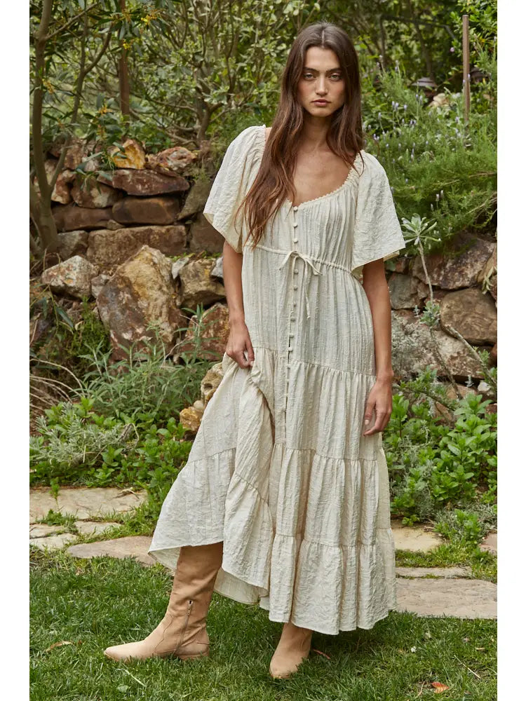 Woven Cotton Tencel Button Down Sweetheart Neck Short Sleeve Tiered Flare Maxi Dress With Waist Tie Strap And Lace Trim Detail (No Lining)
