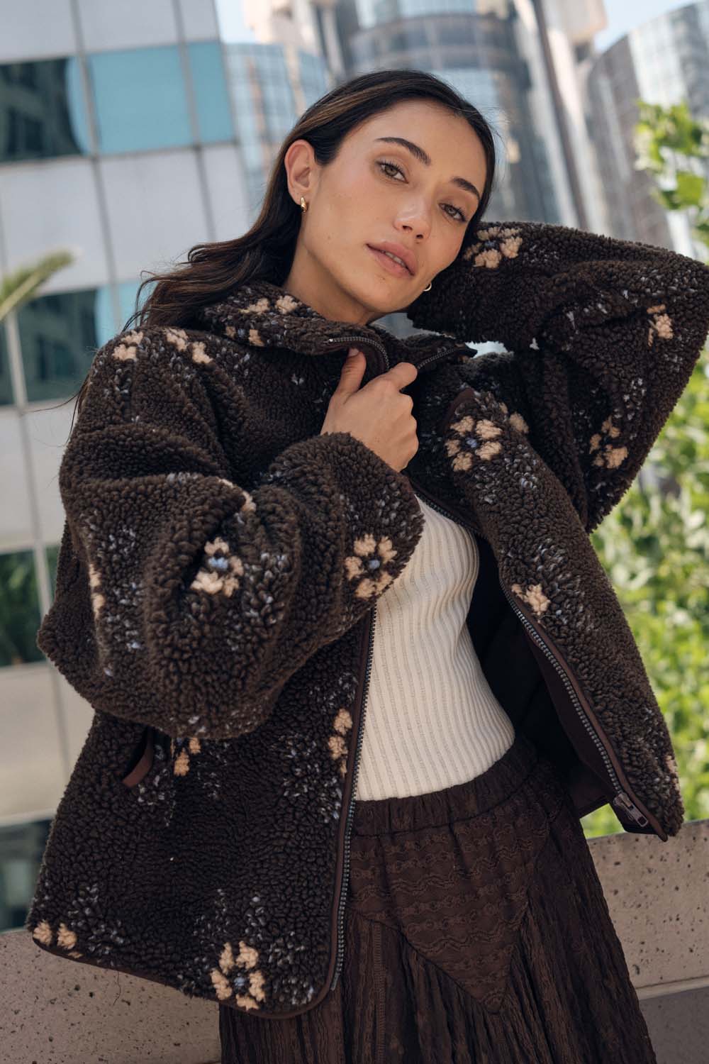 A floral-print sherpa fleece jacket with the following features: