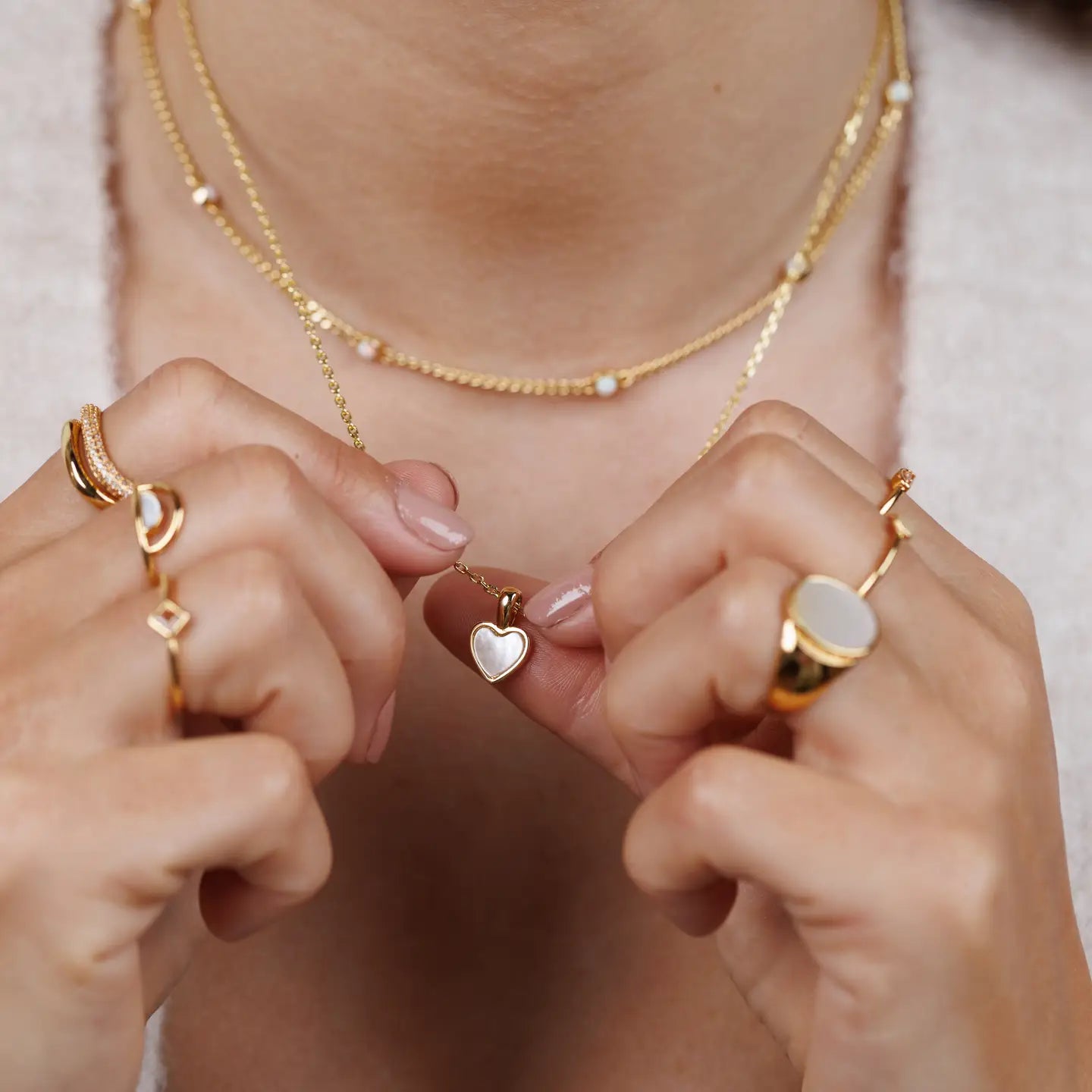 A heart shaped mother of pearl e set in a gold bezel. A beautifully elegant dimond cut chain that catches the light. Perfect for layering.