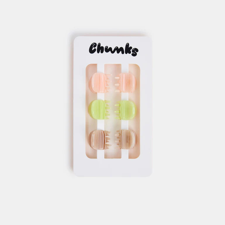 Chunks clips and claws are primarily made from cellulose acetate, a plant-derived bio-plastic, certified ISCC PLUS (International Sustainability and Carbon Certification). Compared to petroleum-based plastic, acetate is more durable and more biodegradable at end of life.