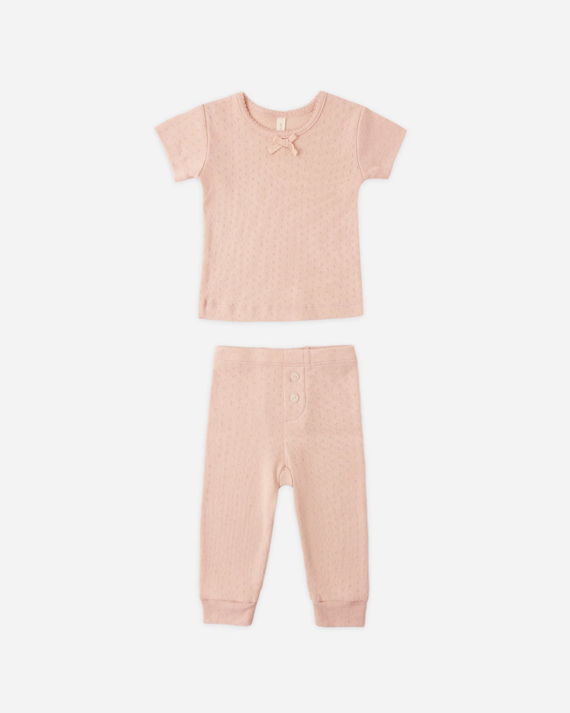This sweet pointelle set features a short sleeve shirt and leggings with an elastic waistband and faux shell buttons at center front.