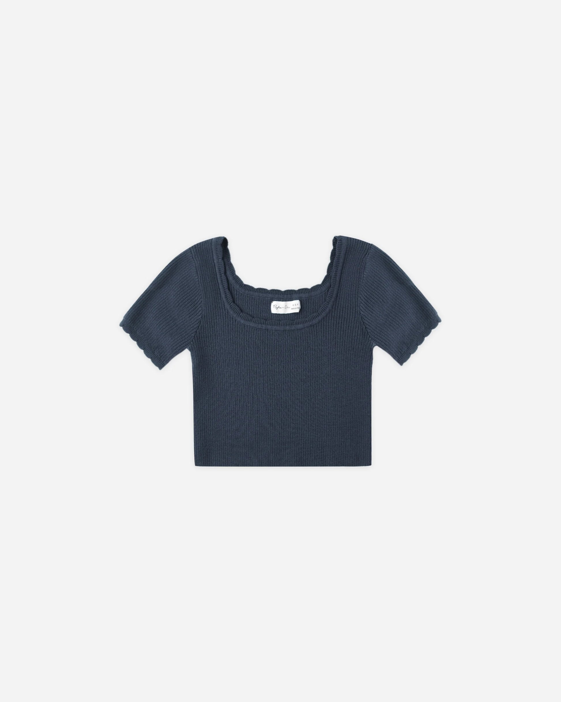Our cropped-fit Scalloped Tee is a versatile fall staple, crafted from delicate pointelle knit fabric and detailed with scalloped sleeves and neckline.