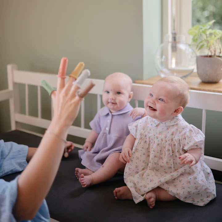Crafted from non-toxic silicone, Mushie finger puppets fit on small fingers, making them easy for children to handle and manipulate. Designed wide enough to also fit most adult fingers, so parents can join in on the fun. The set includes a cat, lamb, bunny, bear, and dog, each brightly colored and detailed to engage young imaginations.