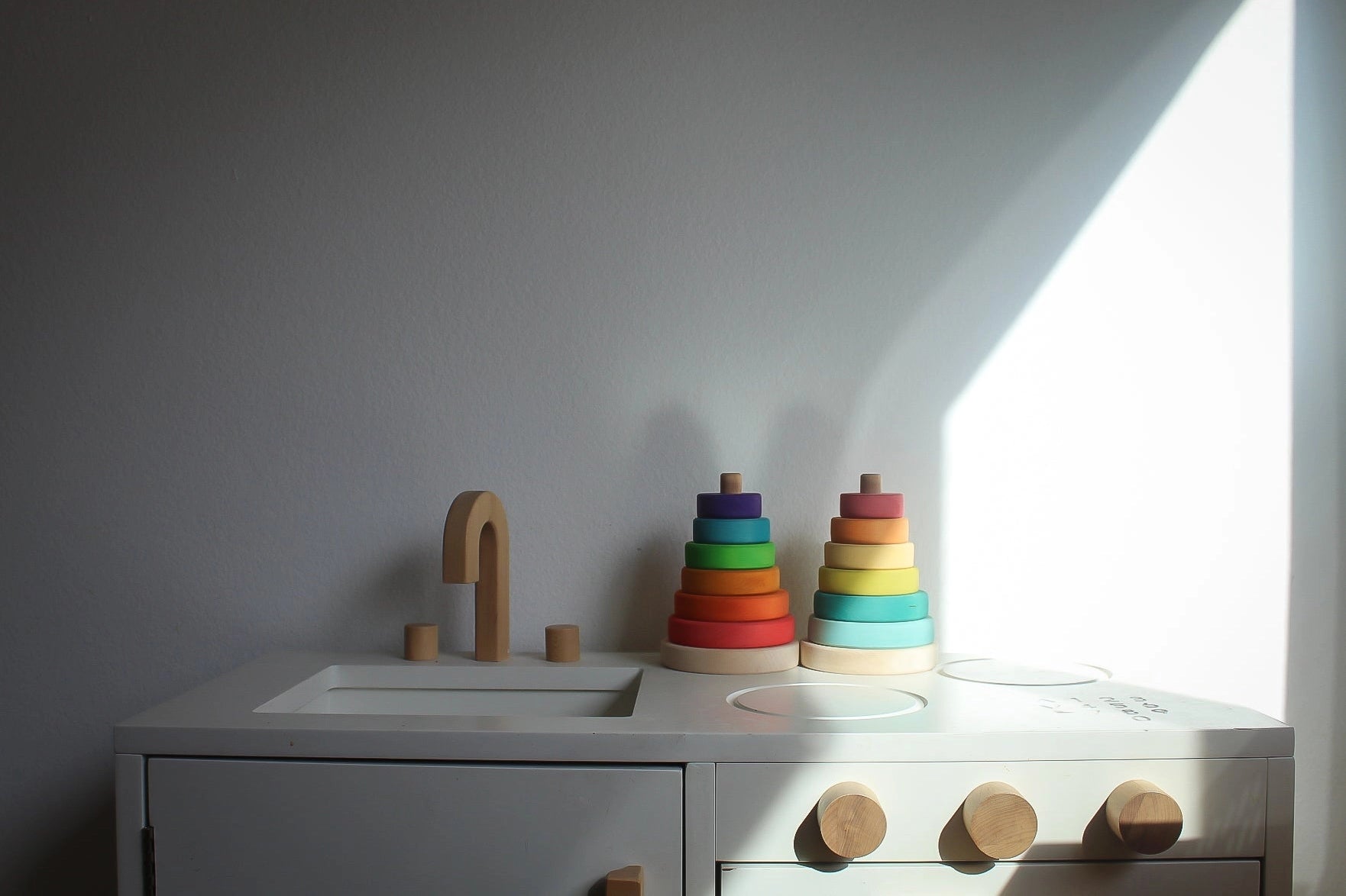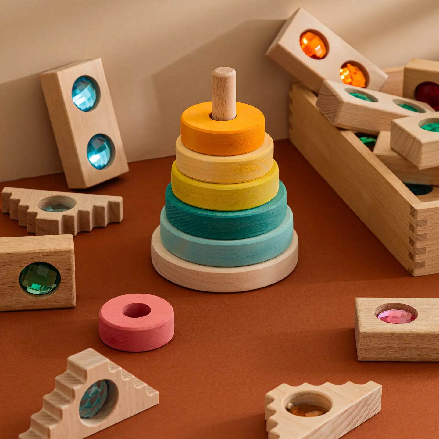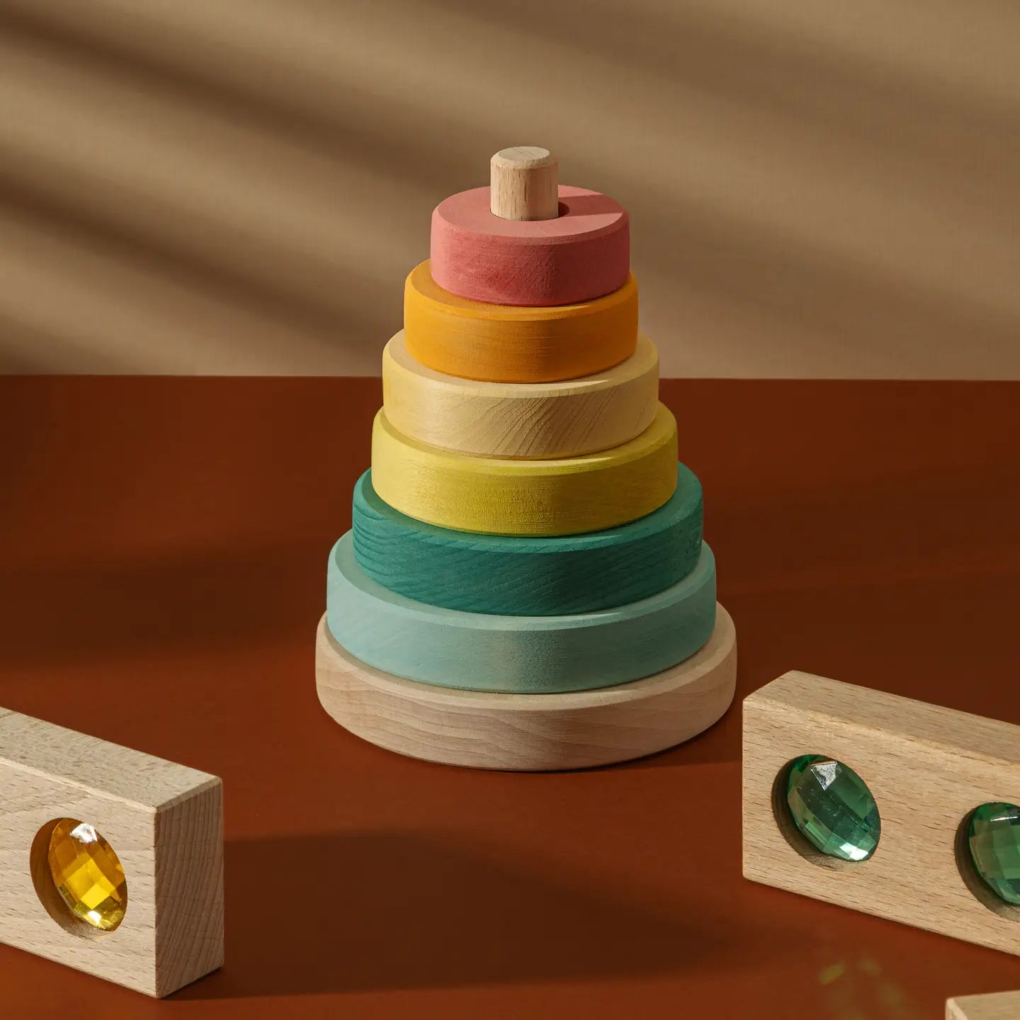 Crafted from durable, child-safe wood with rounded edges, the Suki Stacking Tower offers a safe and sustainable play experience. Each set includes a sturdy wooden base and stackable rings in a range of hues.