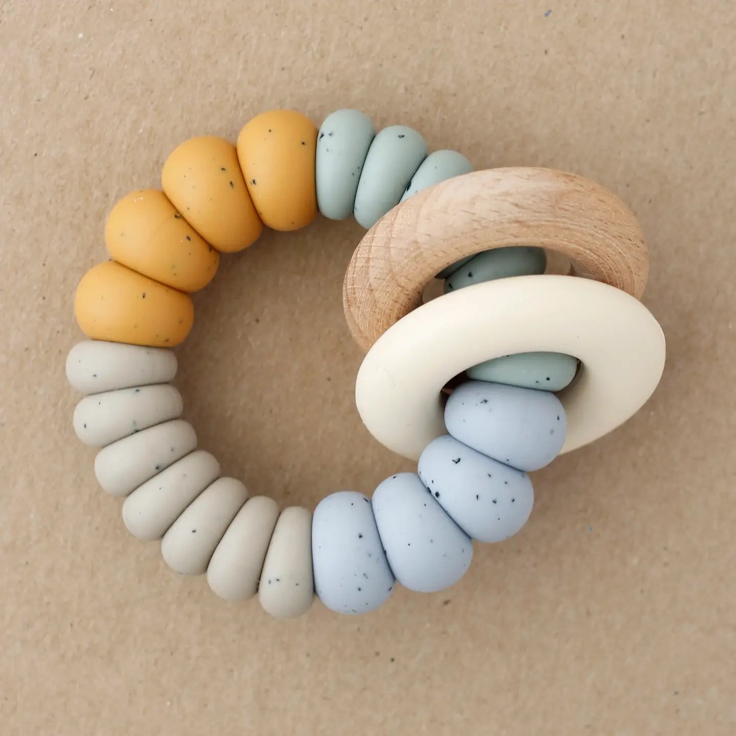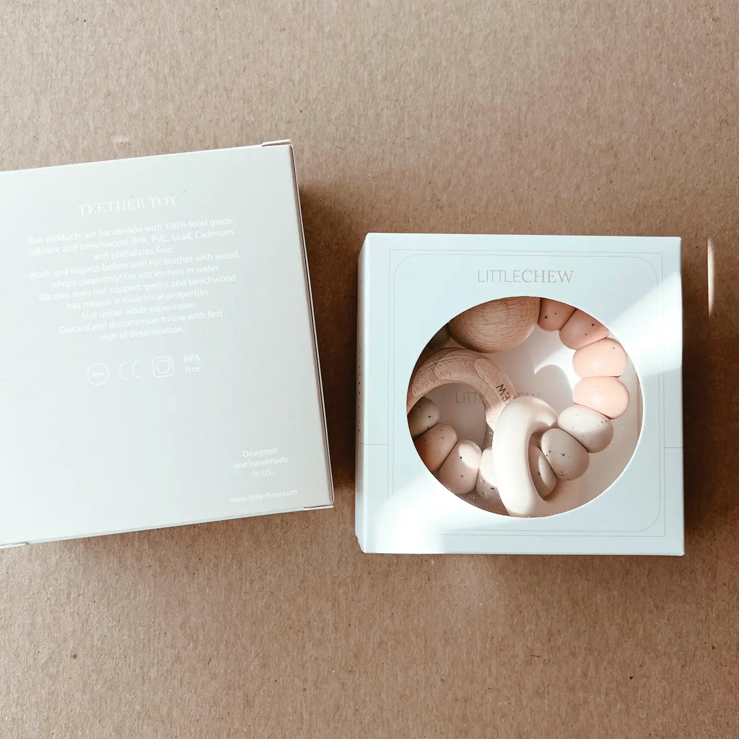 Our Storm teether is a mix of soft silicone and beechwood that will help to soothe sore and itchy gums as much as it will entertain your baby. The simple design is easy for small hands to grab and hold, it is harmless and durable!