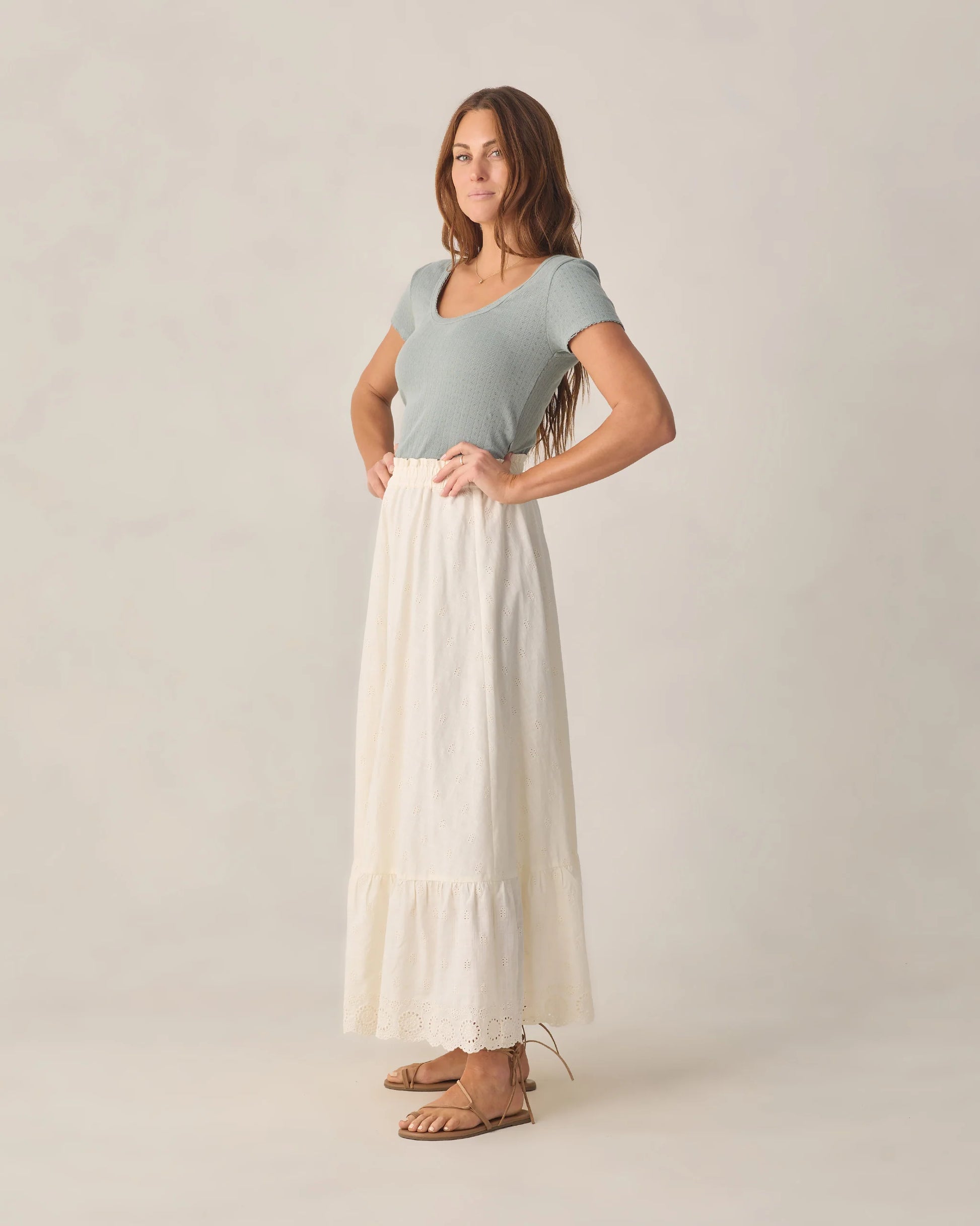 This beautiful maxi skirt is designed with an elastic waistband, all-over bud eyelet embroidery and a scallop edge.