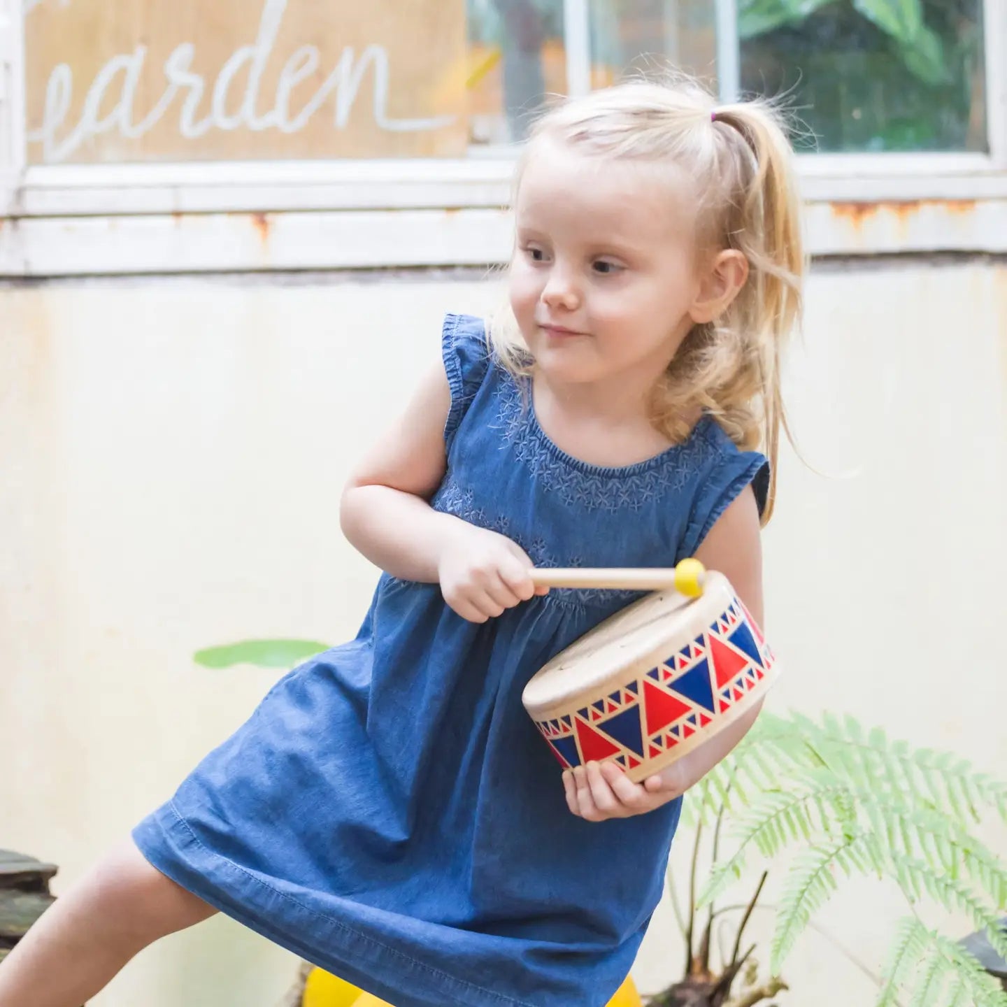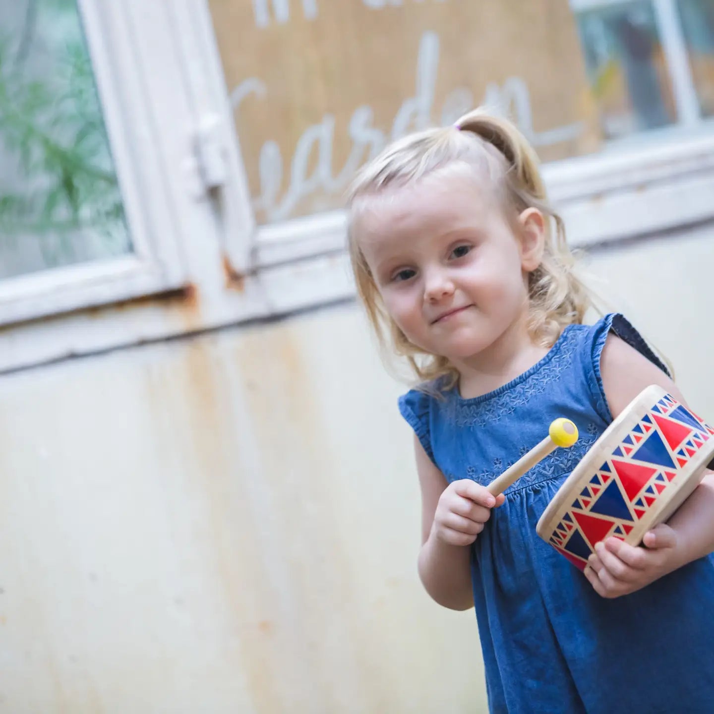 A tympanic drum completed with a drumstick develops children’s spatial perception and arm muscles as well as auditory nerves. The drumstick has a rubber head to soften the sound.