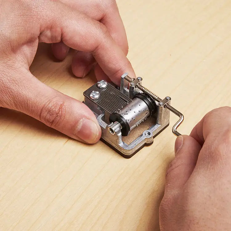 Original hand crank music box. Try on wood or glass or try different surfaces for a new sound. Screws included. Makes a sweet gift.