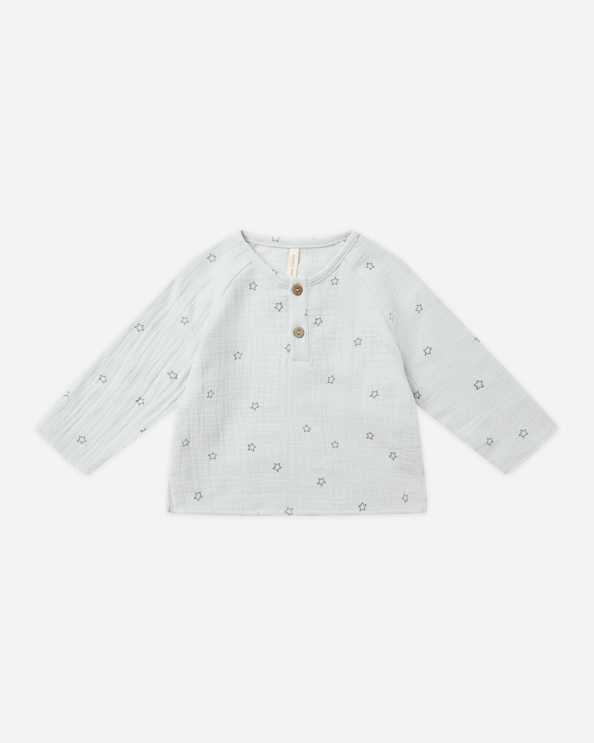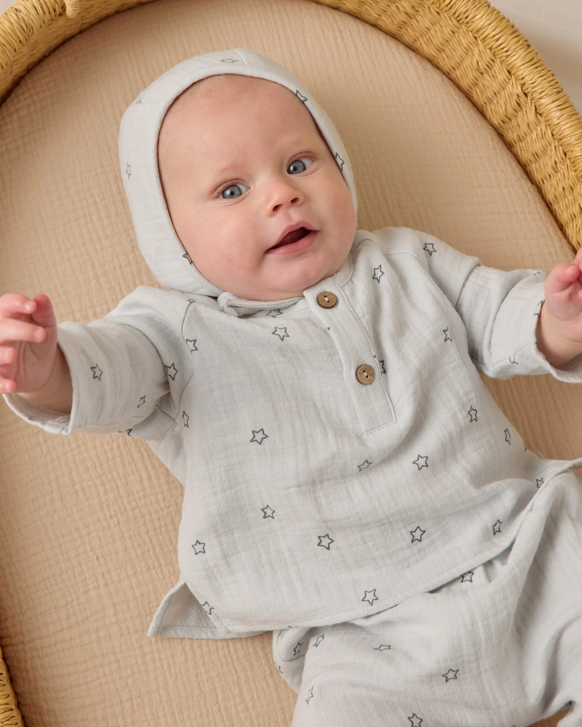 Our Zion Shirt, crafted from soft cotton gauze, features a boxy fit, long sleeves, and a button-front closure for easy wear. Pair with our Woven Pants for a coordinated, dapper look.